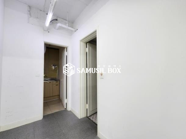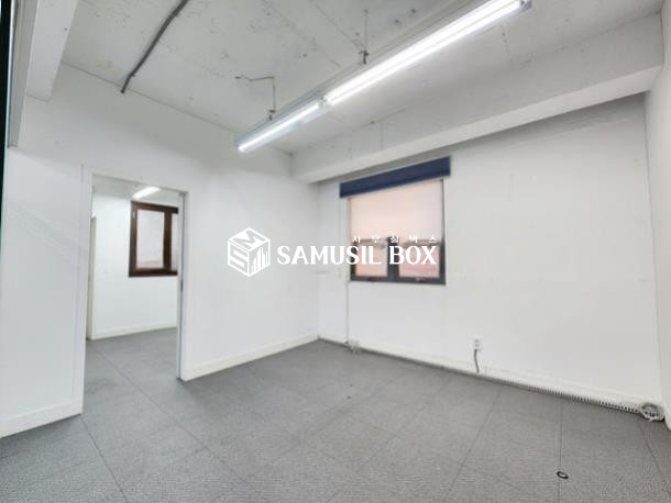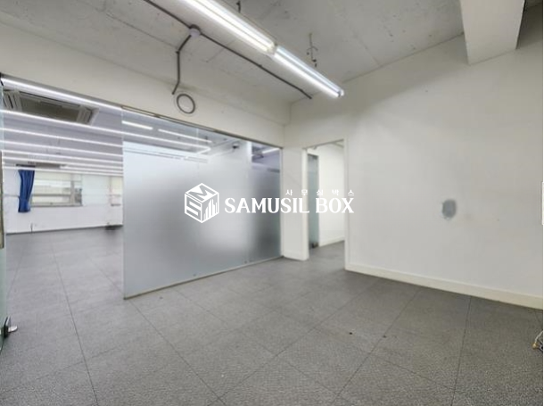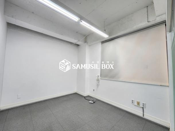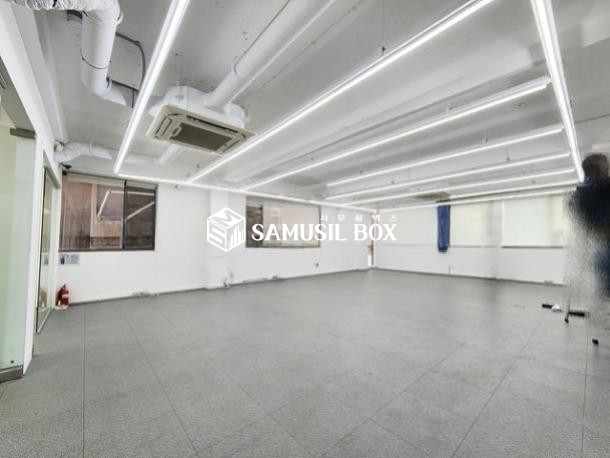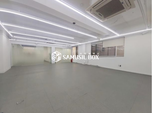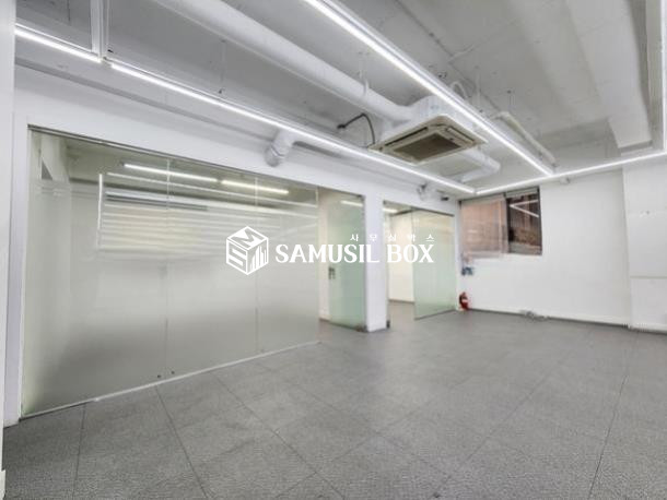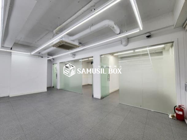 내부 화이트톤 이며 노출천정 , 라인조명 , 천정형냉난방기 , 글라스룸3개 구성됨