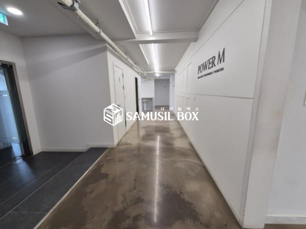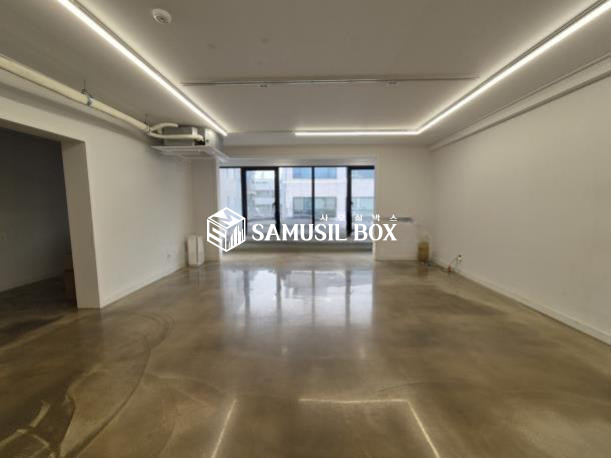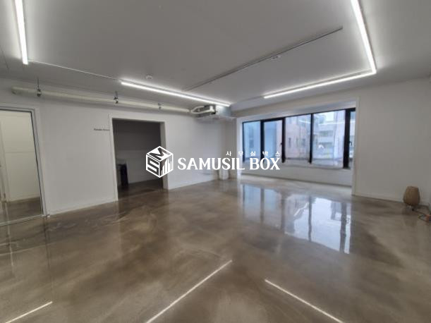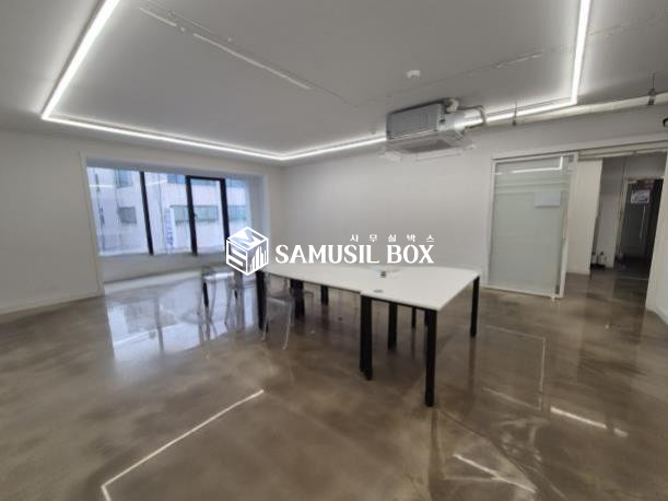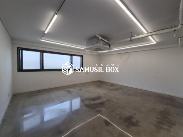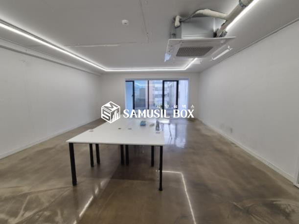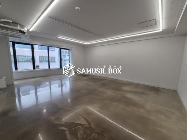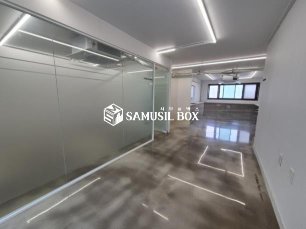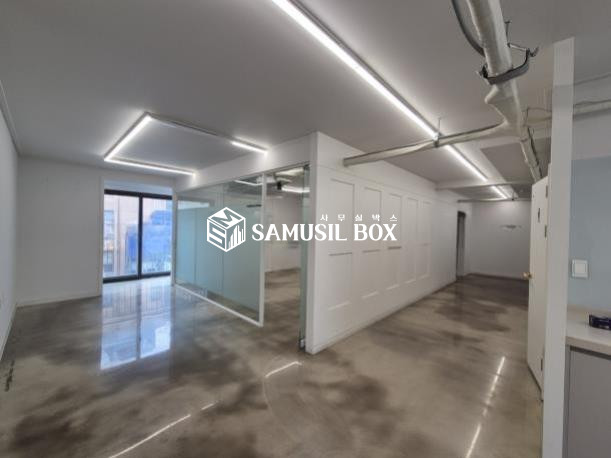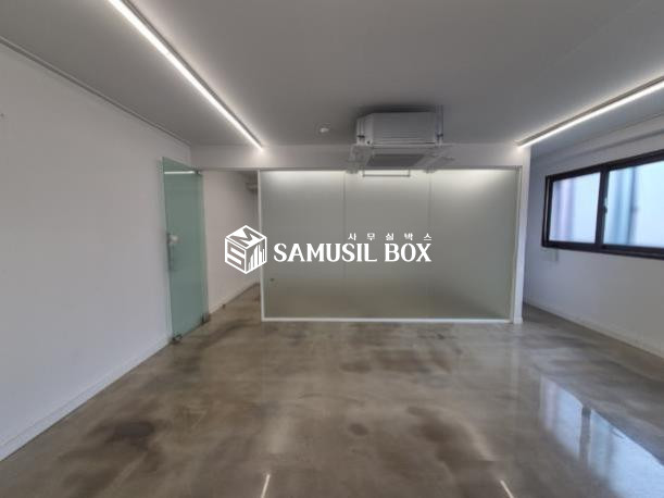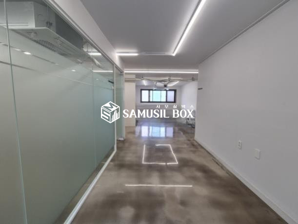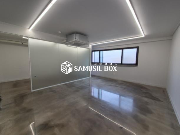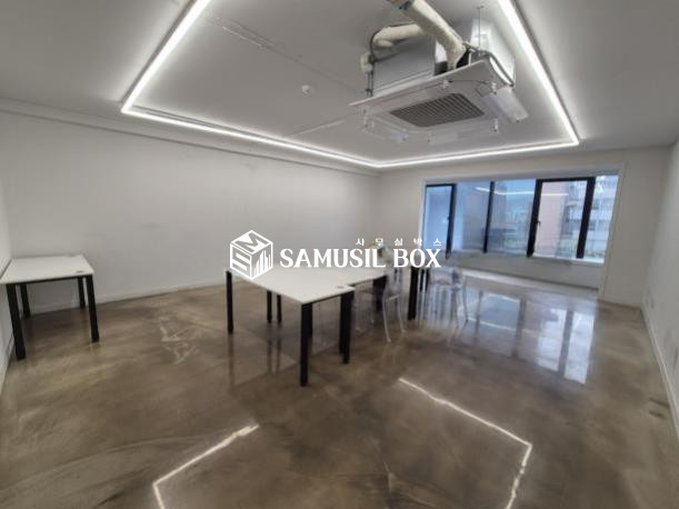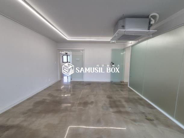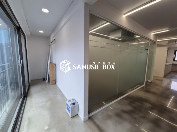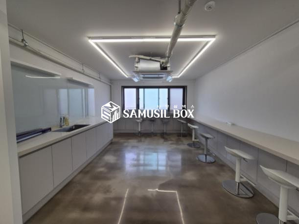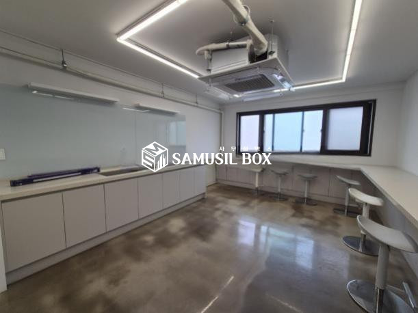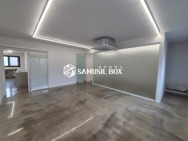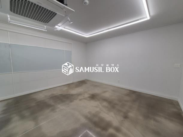 화이트톤의 분위기 / 바닥은 에폭시 / 라인조명 / 천정형 시스템냉난방기 / 글라스룸 5개 / 탕비실